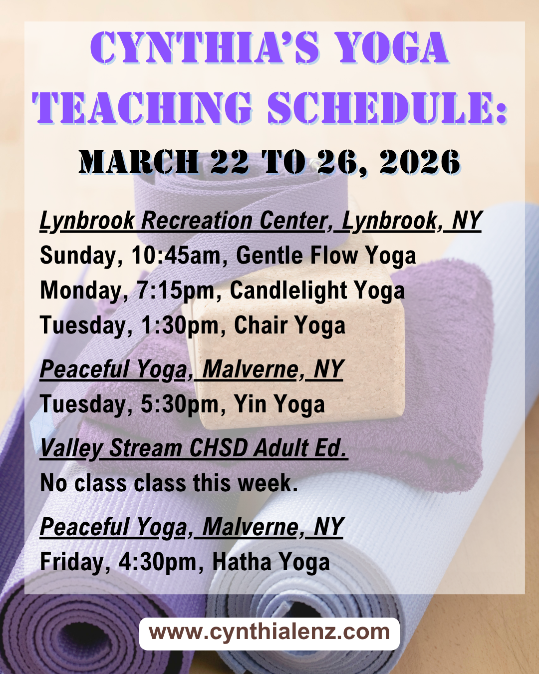 Sign up starting March 8th for Spring Yoga Classes with Cynthia at the Lynbrook Recreation Center! Go to www.lynbrook.recdesk.com