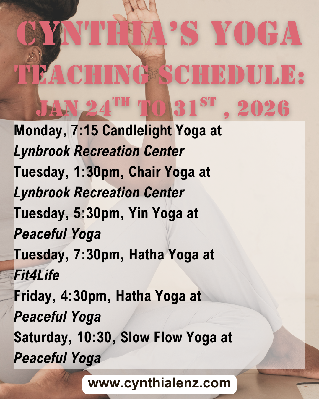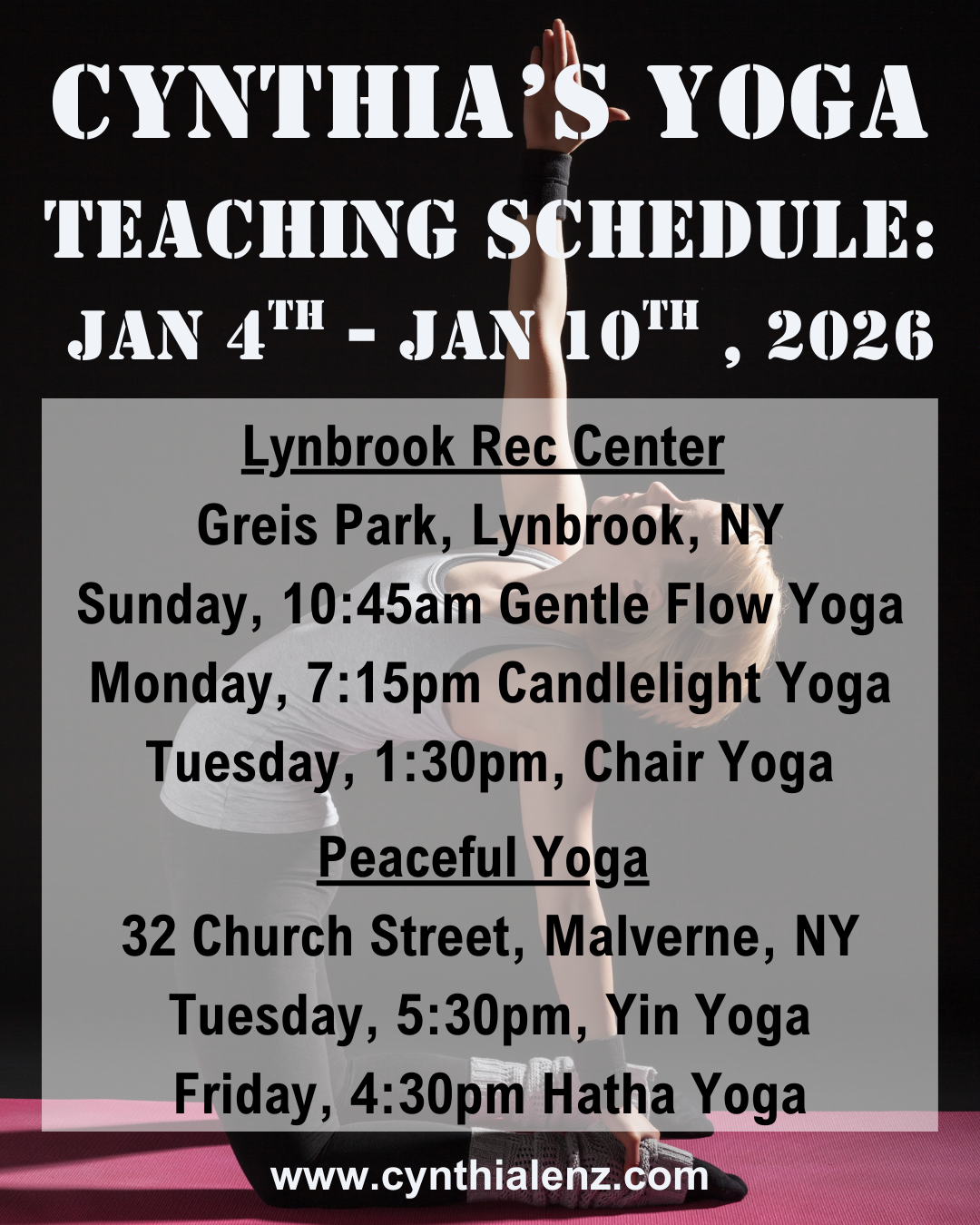I am just finishing my first ever weekly Candlelight Yoga class with Cynthia. What a great experience it was. So relaxing, so informative, so beneficial in so many ways! Cynthia is wonderful! –Lori O.