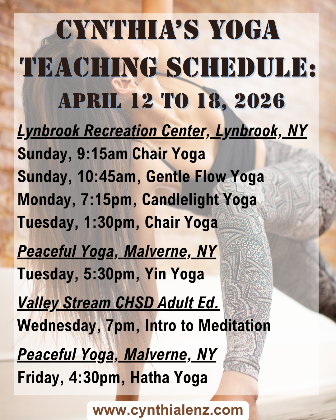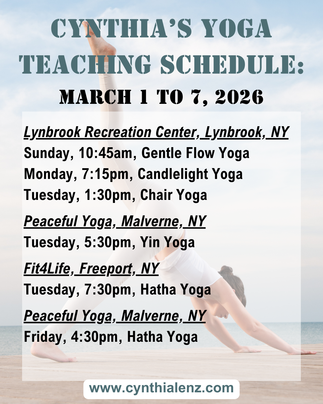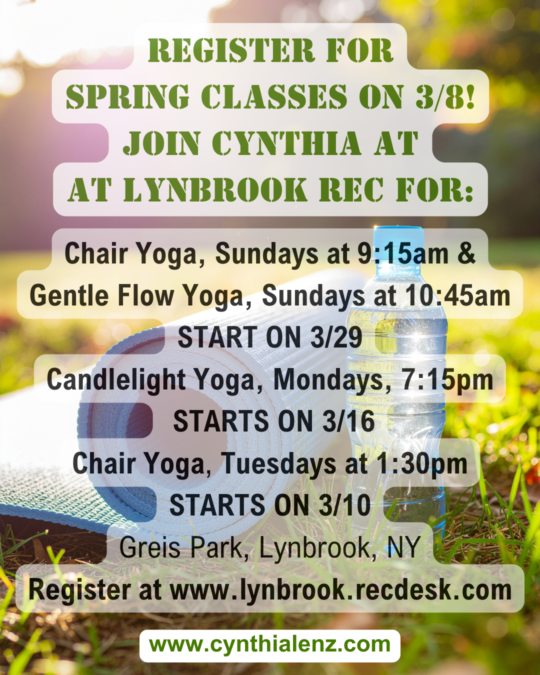 Sign up starting March 8th for Spring Yoga Classes with Cynthia at the Lynbrook Recreation Center! Go to www.lynbrook.recdesk.com