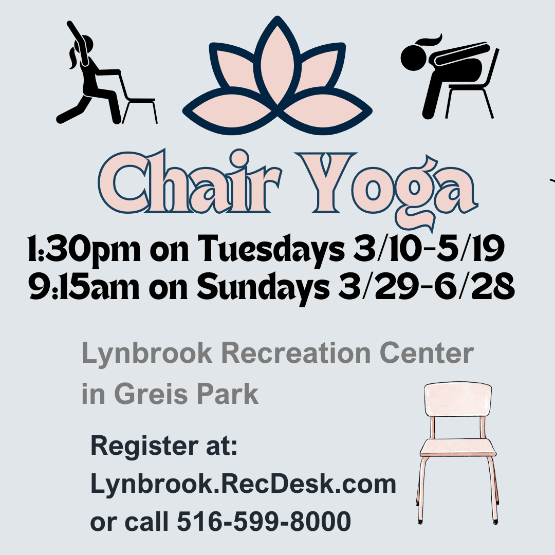 Registration is NOW OPEN for Chair Yoga at Lynbrook Recreation Center. Sign up at www.lynbrook.recdesk.com